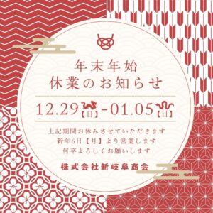 さて、今年も残すところあと少しになりましたが、当店(弊社)では年末年始の営業について、以下の通りご案内申し上げます。 誠に勝手ながら、年末年始期間中は下記の日程で営業を終了し、お客様にはご不便をおかけいたしますが、何卒ご理解賜りますようお願い申し上げます。